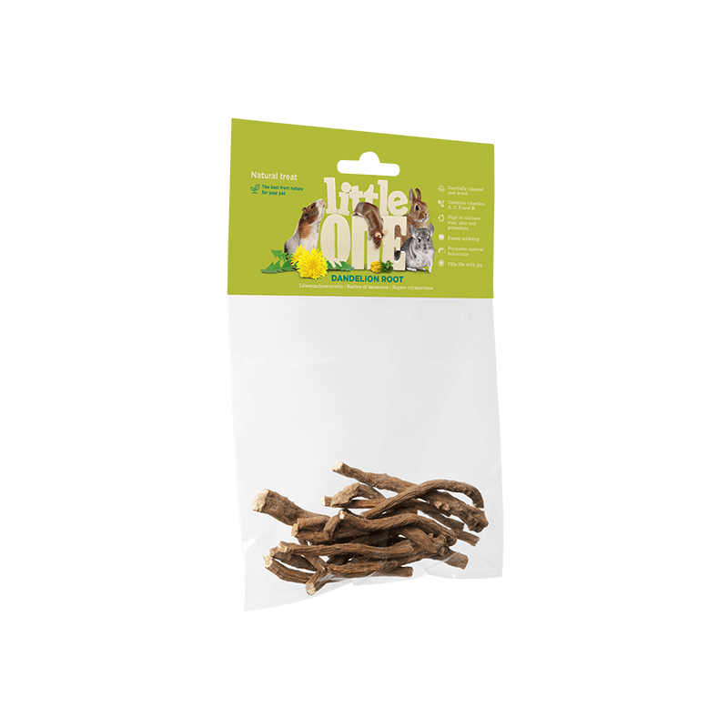 Little One kiaulpienių šaknų skanėstai graužikams, suteikiantys vertingų vitaminų, mineralų ir antioksidantų.