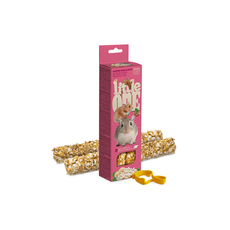 Little One gardžios lazdelės žiurkėnams, pelėms ir smiltpelėms su išpūstais ryžiais ir riešutais. Sveikas ir maistingas užkandis, puikiai tinkantis augintinio mitybai paįvairinti ir dantims stiprinti!