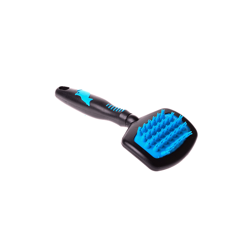 Happet masažinis šepetys šunims ir katėms, skirtas kasdienei kailio priežiūrai ir maudymui. Su guminiais, masažiniais šereliais, švelniai masažuojančiais odą ir kruopščiai įtrinančiais šampūną.