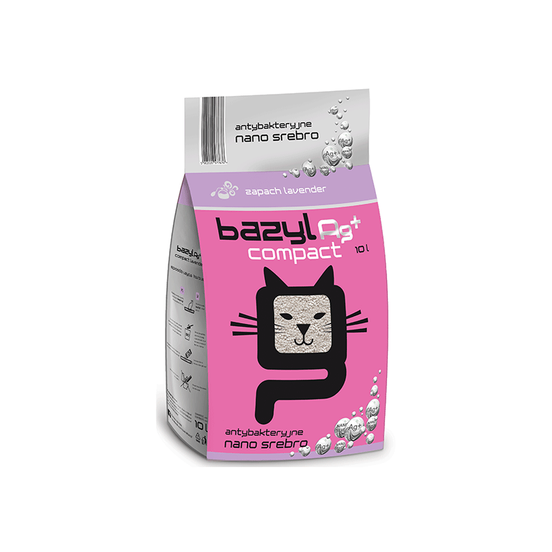 Bazyl Ag+ Compact levandų kvapo bentonitinis kraikas katėms, papildytas natūraliu antibiotiku – nanosidabru, turinčiu antiseptinį poveikį.