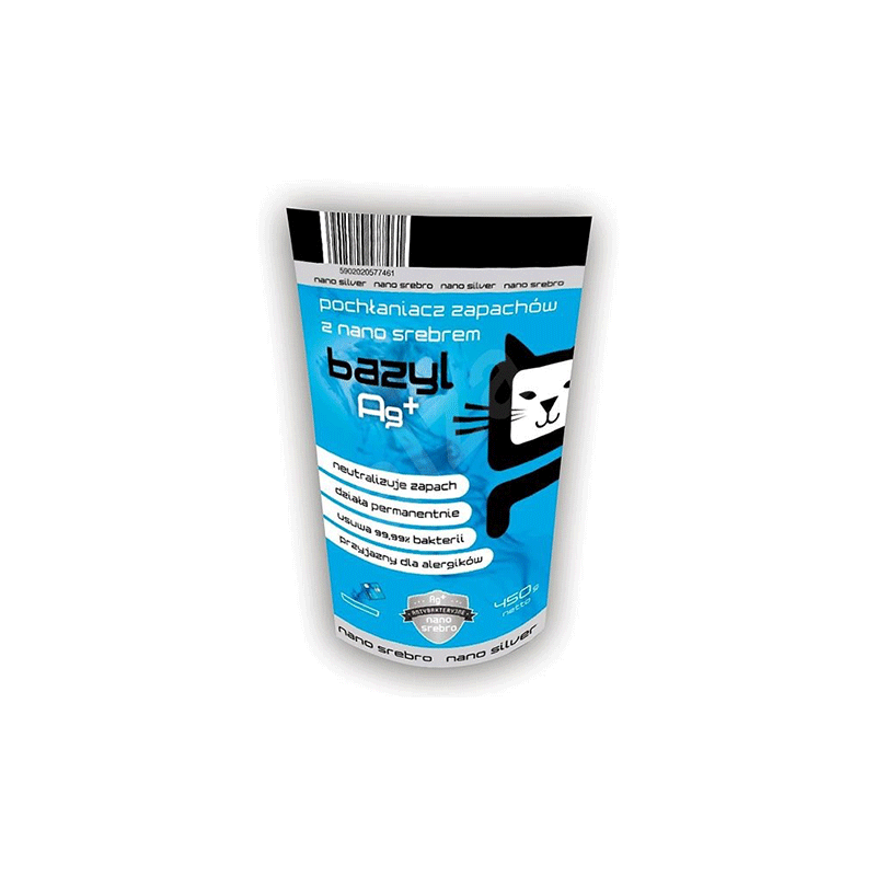 Bazyl Ag+ Odour Absorber, 450 g – nanosidabru papildyti bentonito milteliai, stabdantys bakterijų dauginimąsi kraiko dėžutėje.