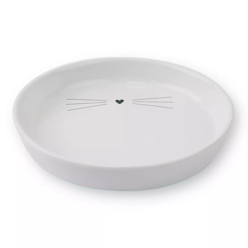Hap plokščias dubenėlis katėms su mielu paveikslėiu, pagamintas iš tvirtos, higieniškos keramikos.