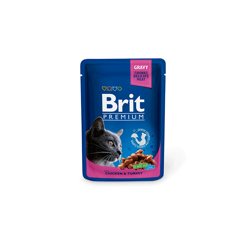 Brit Premium maistas katėms su ypač gardžiais vištienos ir kalakutienos gabalėliais padaže.