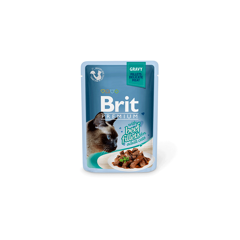 Brit Premium Delicate Beef in Gravy – aukštos kokybės kačių konservai su sultingais jautienos gabalėliais padaže.