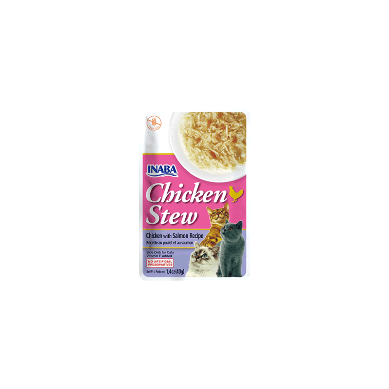 Ciao Cat Chicken Stew with Salmon – kačių maistas su plėšytos vištienos ir lašišos gabalėliais sultinyje.