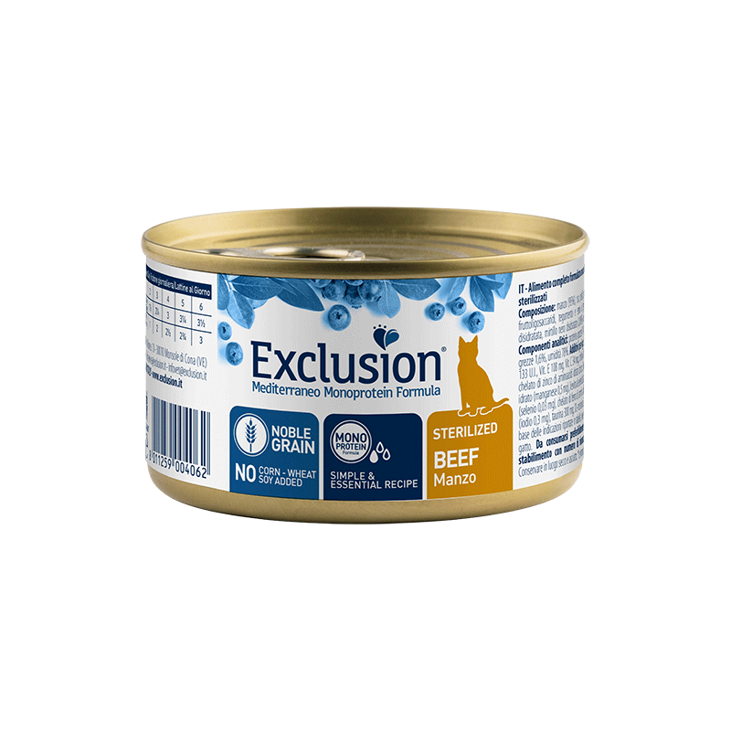 Exclusion šlapias maistas sterilizuotoms katėms su jautiena, padedantis palaikyti sveiką šlapimo takų veiklą. Kačių konservai papildyti išskirtiniais Viduržemio jūros regiono supermaisto ingredientais, kurie suteikia vertingų maistinių medžiagų.