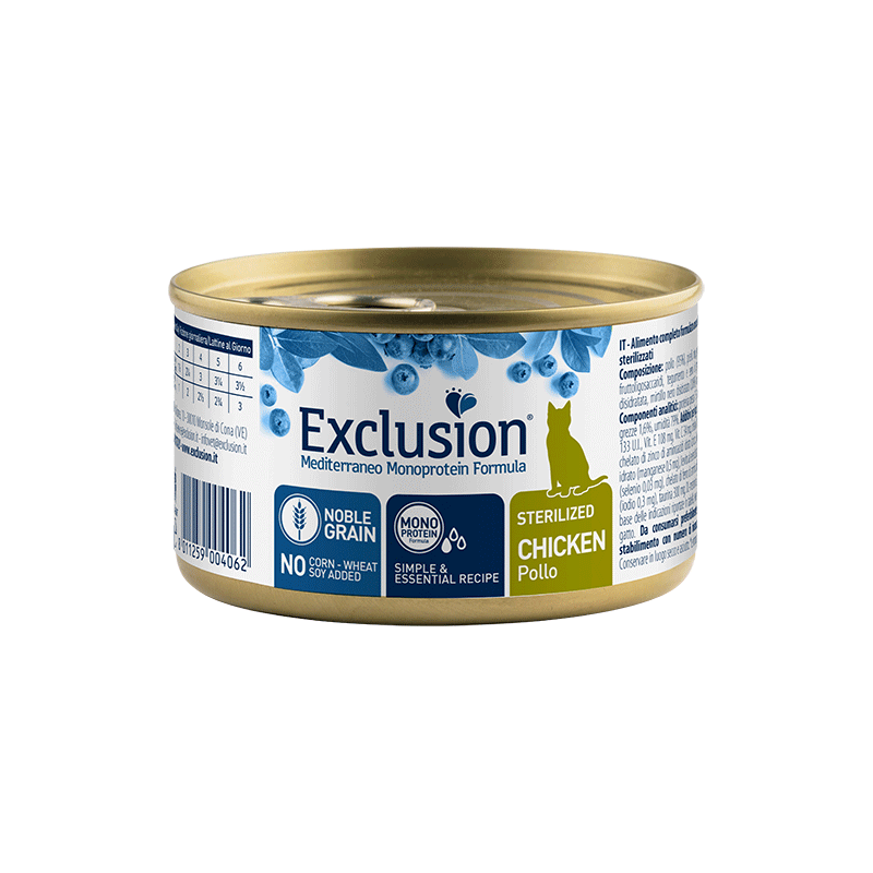 Exclusion šlapias maistas sterilizuotoms katėms su vištiena, padedantis palaikyti sveiką šlapimo takų veiklą. Kačių konservai papildyti išskirtiniais Viduržemio jūros regiono supermaisto ingredientais, kurie suteikia vertingų maistinių medžiagų.
