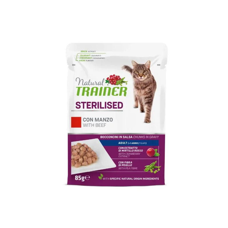 Natural Trainer konservai sterilizuotoms katėms su jautiena. Gardūs mėsos gabalėliai padaže, papildyti spanguolių ekstraktu ir žirniais, naudingais virškinimui ir šlapimo takų veiklai.