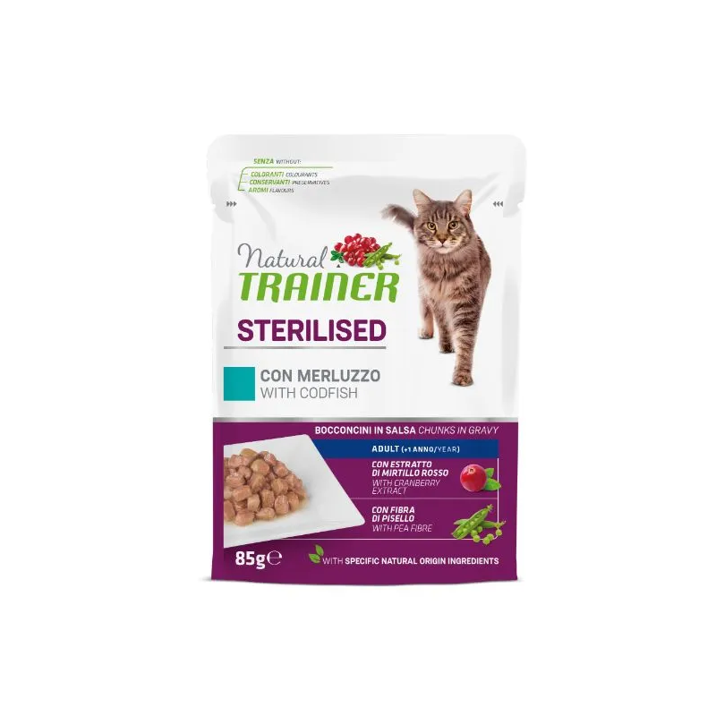 Natural Trainer konservai sterilizuotoms katėms su menke. Gardūs žuvies gabalėliai padaže, papildyti spanguolių ekstraktu ir žirniais, naudingais virškinimui ir šlapimo takų veiklai.