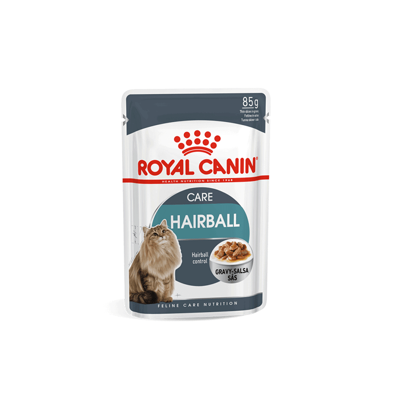 Royal Canin Hairball Care in Gravy – šlapias maistas katėms padaže, stimuliuojantis žarnyno veiklą ir neleidžiantis susidaryti plaukų kamuoliukams skrandyje.