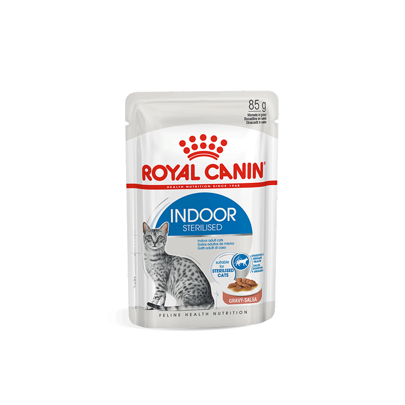 Royal Canin Indoor in Gravy – šlapias maistas katėms padaže, padedantis palaikyti gerą virškinimo ir šlapimo takų būklę.