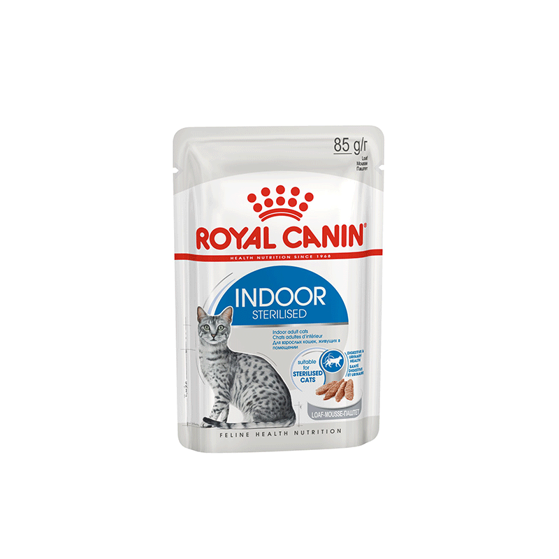 Royal Canin konservai sterilizuotoms katėms, stiprinantys virškinimo ir šlapimo takų sveikatą. Maistas sudarytas iš minkštų pašteto gabalėlių padaže ir pritaikytas uždarose patalpose gyvenančioms katėms.