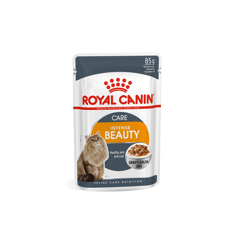 Royal Canin Intense Beauty in Gravy – šlapias maistas katėms padaže, padedantis palaikyti sveiką odą ir blizgų kailį.