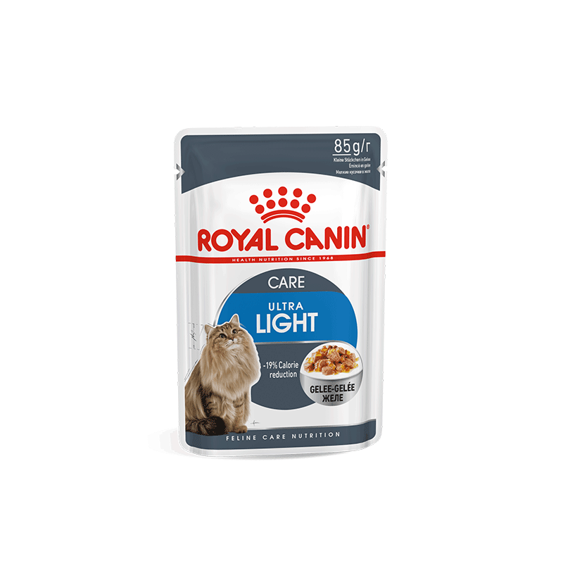 Royal Canin Ultra Light in Jelly – šlapias maistas katėms drebučiuose, padedantis palaikyti vidutinį kūno svorį ir sveiką šlapimo sistemos veiklą.