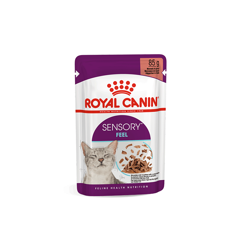 Royal Canin Sensory Feel in Gravy – išskirtinės tekstūros kačių maistas padaže, sužadinantis ypatingą skonio pojūtį.