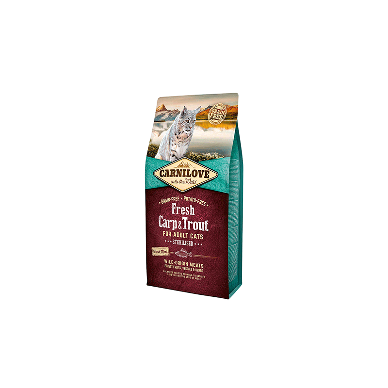 Carnilove Fresh Carp & Trout Sterilised – sausas kačių maistas be grūdų, subalansuotas sterilizuotoms katėms.