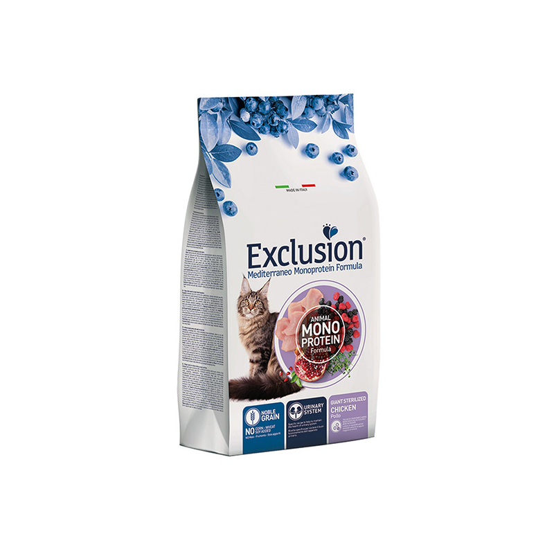Exclusion vieno baltymo maistas didelėms, sterilizuotoms katėms su vištiena. Sausas maistas papildytas išskirtiniais Viduržemio jūros regiono supermaisto ingredientais, kurie suteikia augintiniui vertingų maistinių medžiagų.