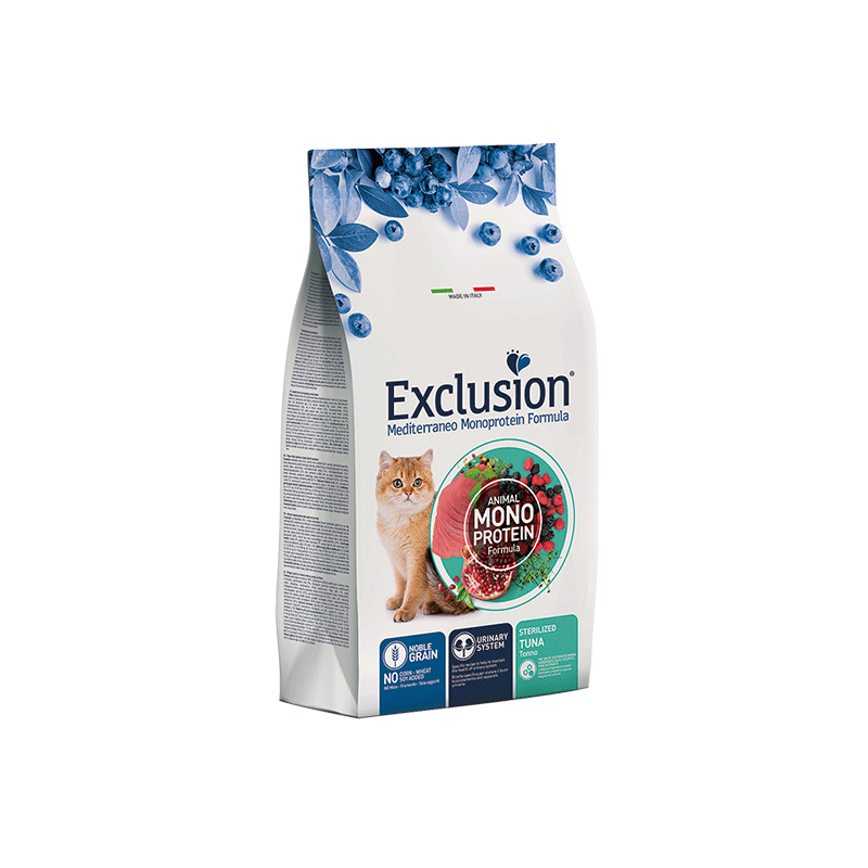 Exclusion maistas sterilizuotoms katėms su tunu, padedantis palaikyti sveiką šlapimo takų veiklą. Sausas maistas papildytas išskirtiniais Viduržemio jūros regiono supermaisto ingredientais, kurie suteikia vertingų maistinių medžiagų.