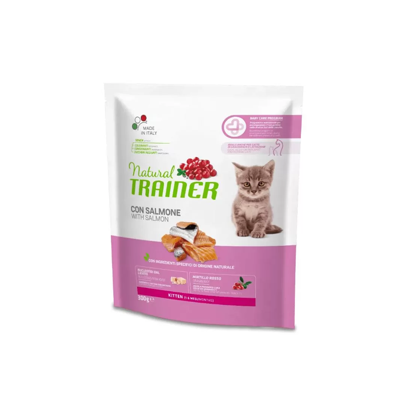 Natural Trainer sausas maistas kačiukams su lašiša, taip pat tinkantis ir vaikingoms, maitinančioms katėms.