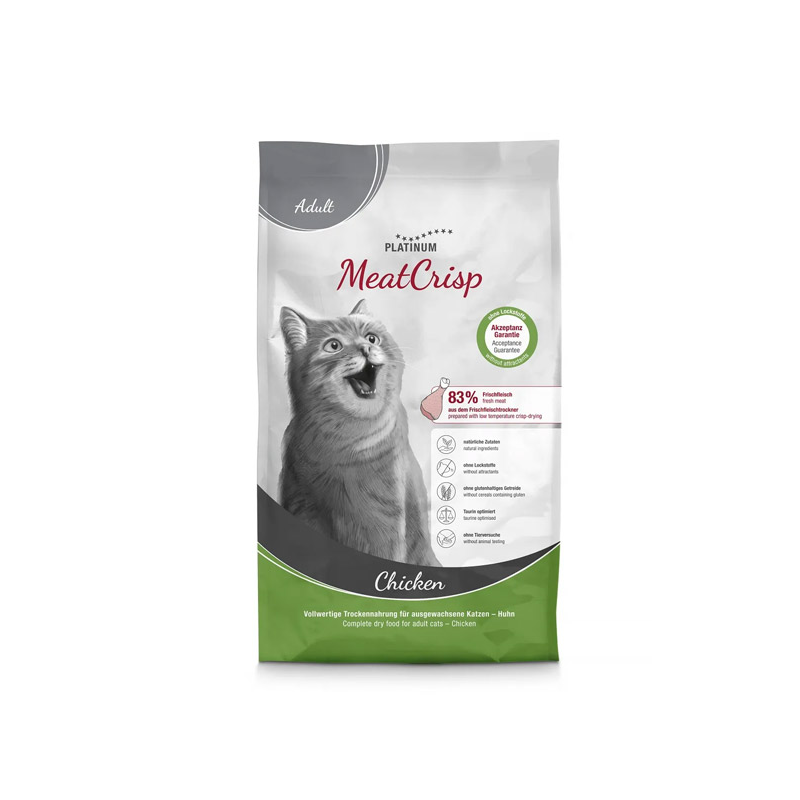 Platinum MeatCrisp maistas katėms su vištiena. Pagaminta pagal FSG technologiją, kurios metu šviežia žuvis ir kiti ingredientai išdžiovinami iki traškumo žemoje temperatūroje ir taip išsaugo natūralų skonį bei maistingumą.