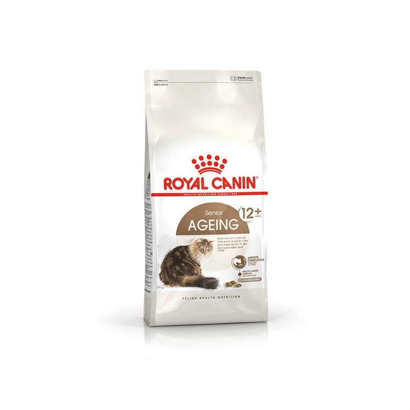 Royal Canin Ageing 12+ – sausas maistas senyvoms katėms, gausus vertingų, senėjimo procesą palengvinančių maistinių medžiagų.
