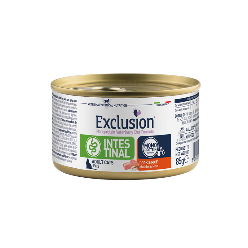 Exclusion Intestinal konservai katėms su kiauliena ir ryžiais, 85 g