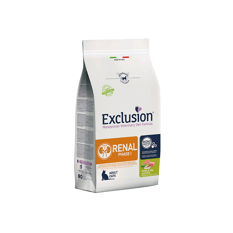 Exclusion Renal Diet Phase I maistas katėms su kiauliena, žirniais ir ryžiais, 1,5 kg