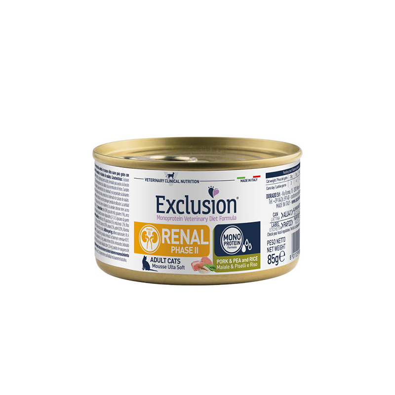 Exclusion Renal Diet Phase II – maistas katėms su kiauliena, žirniais ir ryžiais.