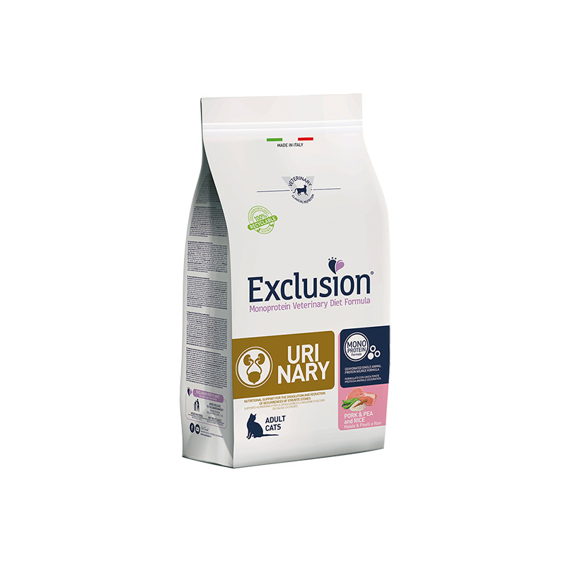 Exclusion Urinary maistas katėms su kiauliena, žirniais, ryžiais, 1,5 kg