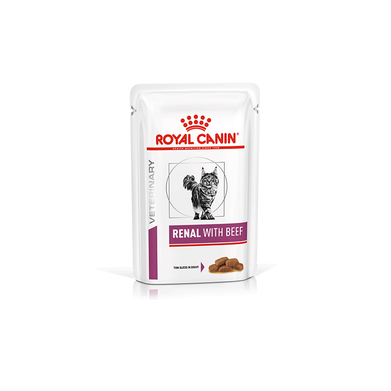 Royal Canin Cat Renal with Beef – šlapias maistas katėms su jautiena, padedantis palaikyti sveikus inkstus.