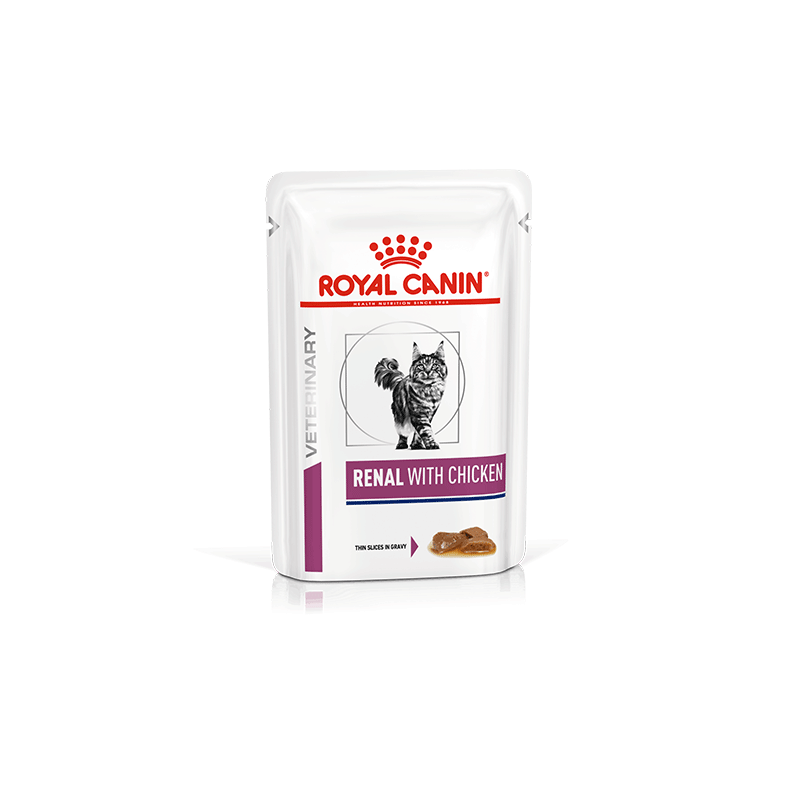 Royal Canin Cat Renal with Chicken – šlapias maistas katėms su vištiena, padedantis palaikyti sveikus inkstus.