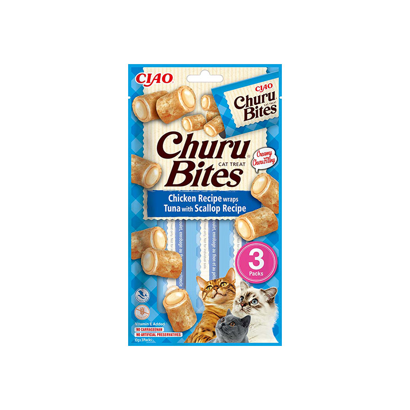 Churu Bites – minkšti kačių skanėstai su tunu ir šukutėmis.