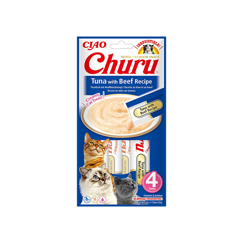 Churu skanėstai katėms, kurių sudėtyje mažai kalorijų, gausu drėgmės ir nėra grūdų. Gardus kreminis užkandis iš tuno ir jautienos, mėgstamas visų kačių!