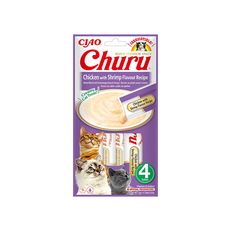 Churu skanėstai katėms, kurių sudėtyje mažai kalorijų, gausu drėgmės ir nėra grūdų. Gardus kreminis užkandis iš vištienos ir krevečių, mėgstamas visų kačių!