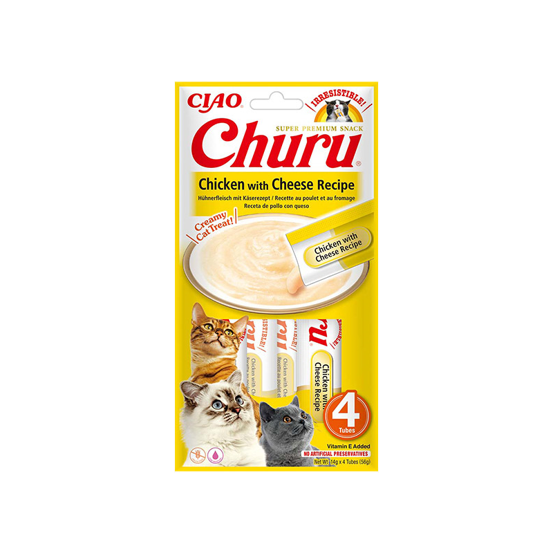 Churu skanėstai katėms, kurių sudėtyje mažai kalorijų, gausu drėgmės ir nėra grūdų. Gardus kreminis užkandis iš vištienos ir sūrio, mėgstamas visų kačių!