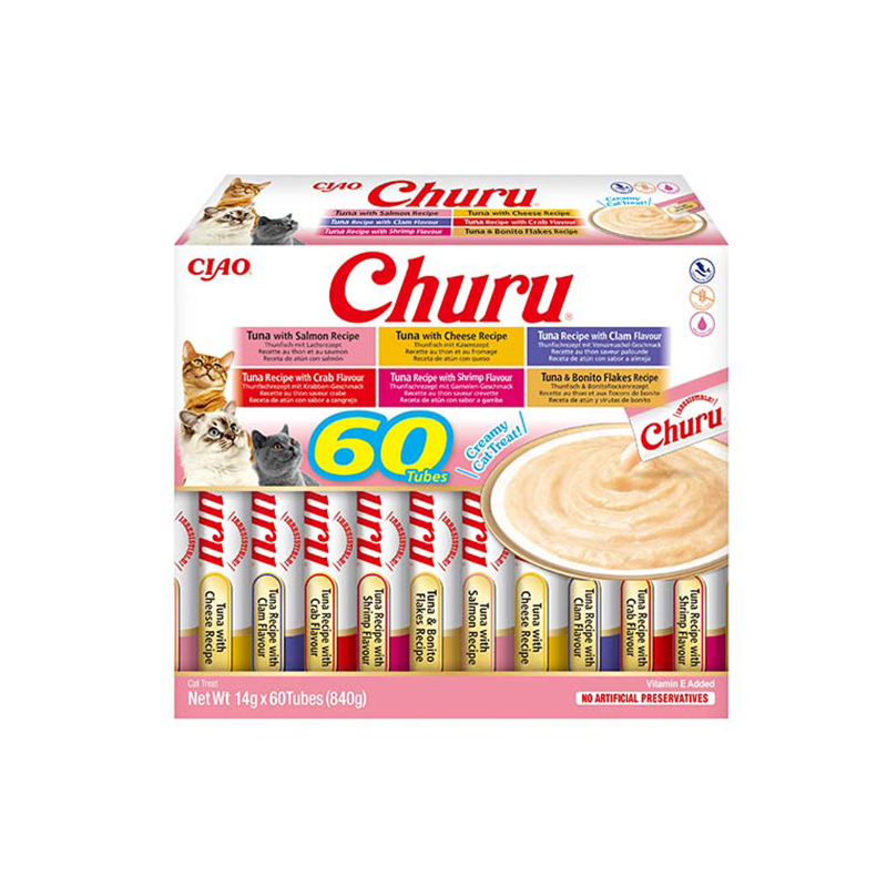 Churu skanėstai katėms, kurių sudėtyje mažai kalorijų, gausu drėgmės ir nėra grūdų. Gardus kreminių užkandžių rinkinys iš tuno, lašišos, krevečių, bonito dribsnių, sūrio ir moliuskų, mėgstamas visų kačių!
