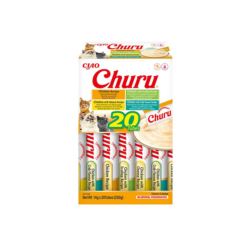 Churu skanėstai katėms, kurių sudėtyje mažai kalorijų, gausu drėgmės ir nėra grūdų. Gardus kreminių užkandžių rinkinys iš vištienos, sūrio, šukučių ir krabų, mėgstamas visų kačių!