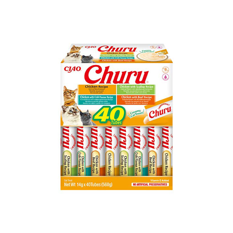 Churu skanėstai katėms, kurių sudėtyje mažai kalorijų, gausu drėgmės ir nėra grūdų. Gardus kreminių užkandžių rinkinys iš vištienos, jautienos, šukučių ir krabų, mėgstamas visų kačių!