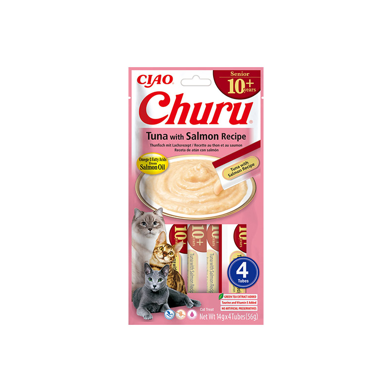 Churu kreminis skanėstas su lašiša ir tunu senyvoms katėms, gausus omega-3 riebalų rūgščių, vitaminų C ir E.