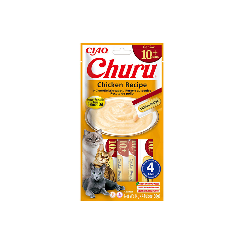 Churu kreminis skanėstas su vištiena senyvoms katėms, papildytas vitaminais C, E ir antioksidantais, kurie palaiko stiprų imunitetą.