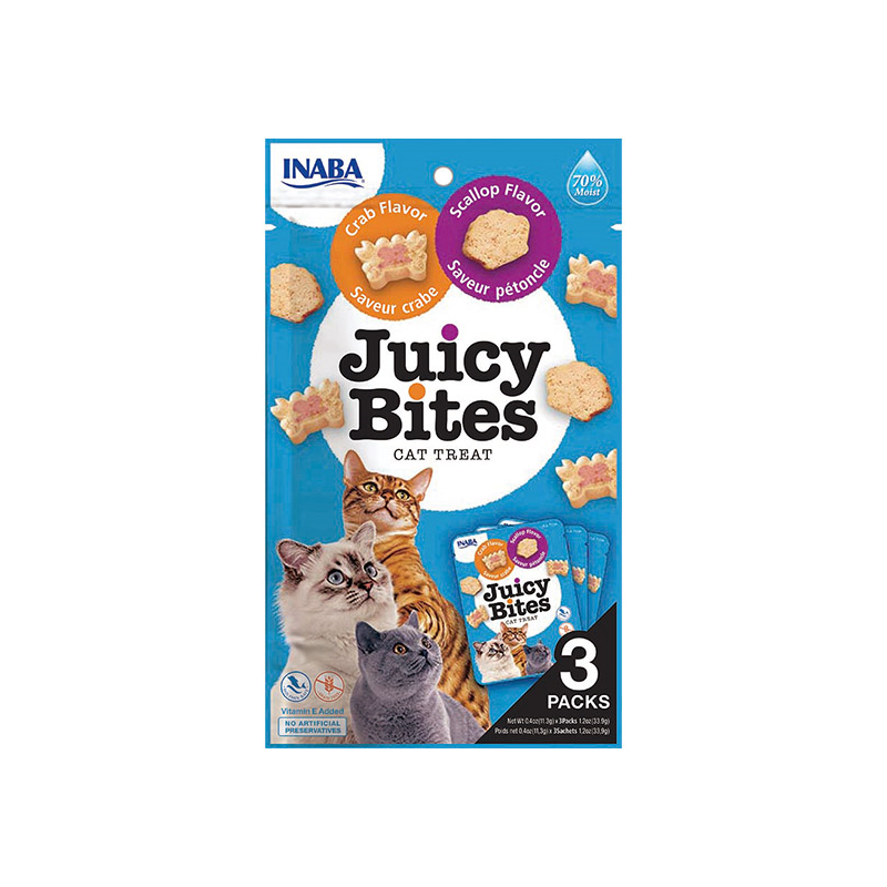 Juicy Bites pusiau drėgni skanėstai katėms. Dviejų rūšių: su šukutėmis ir krabais, todėl yra ypač mėgstami kačių!