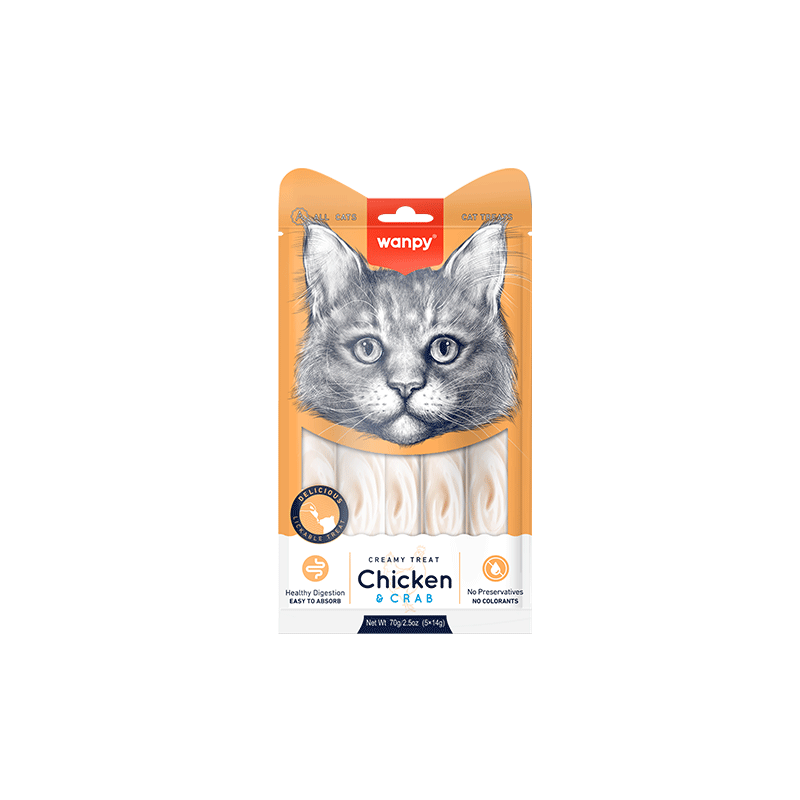 Wanpy kreminiai vištienos ir krabų mėsos skanėstai katėms, padedantys palaikyti sveiką virškinimą. Skanus ir natūralus užkandis Jūsų augintiniui!