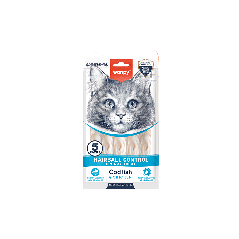 Wanpy kreminiai menkės ir vištienos skanėstai katėms, padedantys sumažinti plaukų kamuoliukų formavimąsi skrandyje. Skanus ir vitaminų gausus užkandis Jūsų augintiniui!