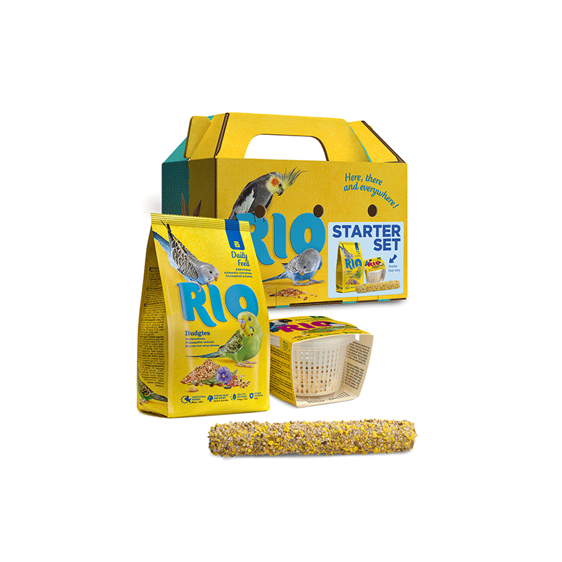 RIO prekių rinkinys naujam banguotosios papūgėlės šeimininkui! Rinkinyje rasite viską, ko reikia pradedant auginti papūgą: kartoninę dėžutę augintiniui transportuoti, pašarą, rinkinį sėkloms daiginti ir gardų skanėstą.