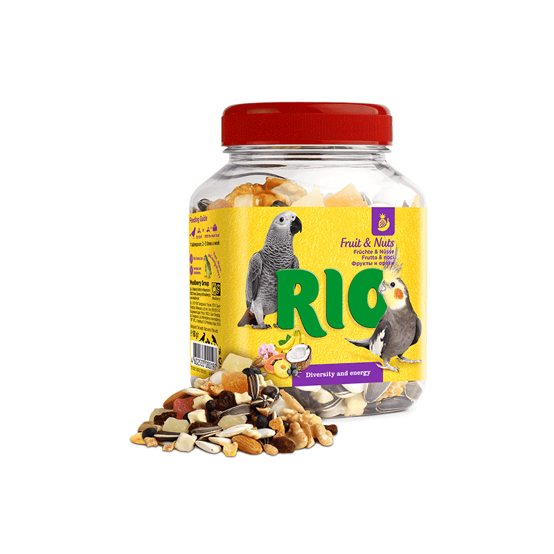 RIO vaisių ir riešutų mišinys papūgoms ir ilgauodegėms papūgėlėms. Puikus energijos, vitaminų ir mineralų šaltinis Jūsų paukščiui!