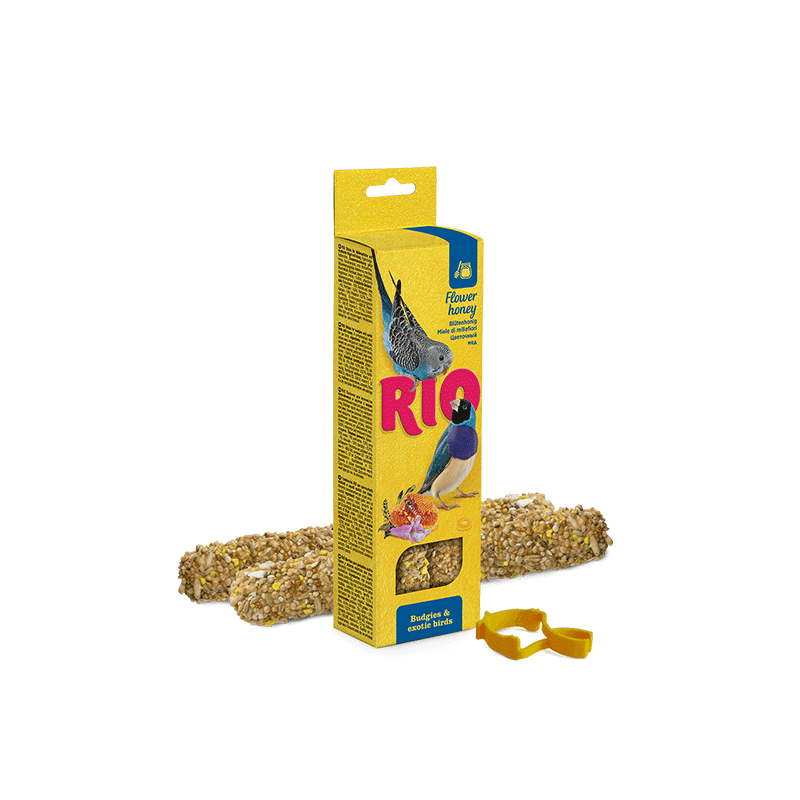 RIO lazdelės banguotosioms papūgoms ir egzotiniams paukščiams su medumi, suteikiančios mitybai įvairovės ir papildomų maistinių medžiagų.