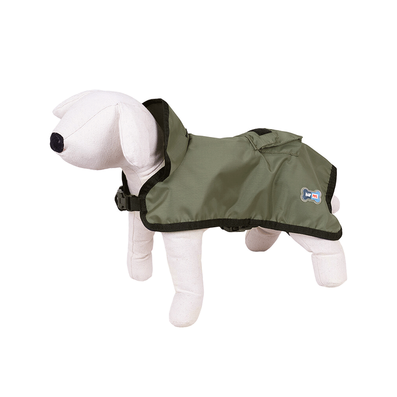Happet chaki spalvos lietpaltis šuniui, pagamintas iš orui pralaidžios ir drėgmei atsparios medžiagos.