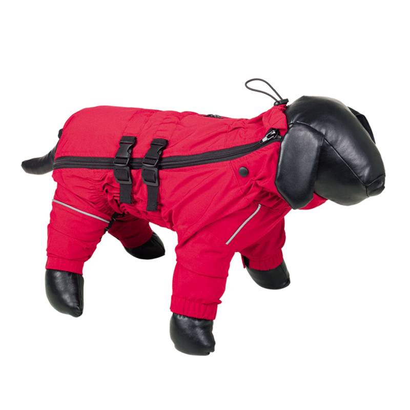 Nobby raudona, neperšlampanti striukė šuniui, su šoniniu užtrauktuku ir atšvaito juostelėmis. Šiltas ir patogus kombinezonas, kuris apsaugos jūsų augintinį nuo šalčio ir lietaus!