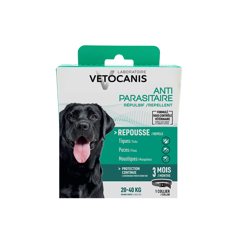 Vetocanis antkaklis šunims nuo erkių, blusų ir uodų, veikiantis iki 3 mėnesių.