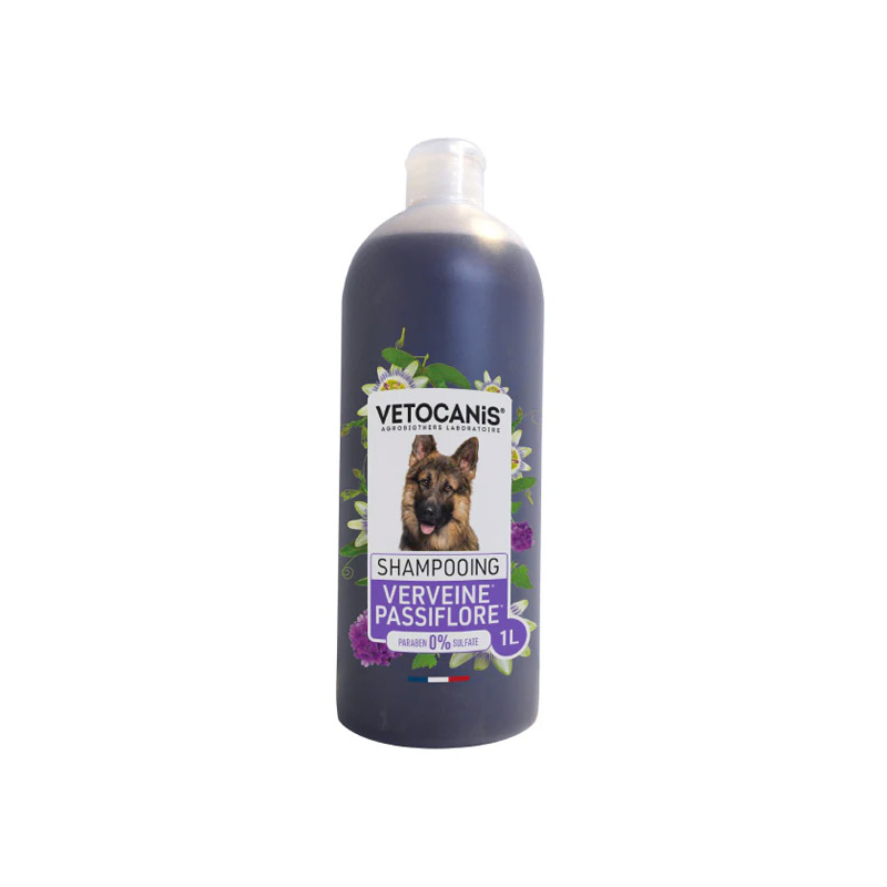 Vetocanis šampūnas šunims, padedantis sudrėkinti šuns odą bei kailį ir suteikiantis jam švelnų pasiflorų kvapą.